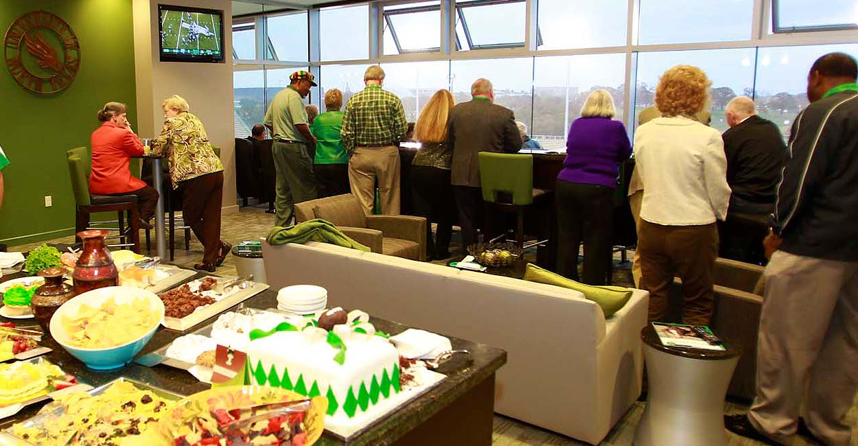 Apogee Stadium’s 21 luxury suites are perfect for hosting friends and family, or your next company outing! Suite amenities include reserved parking spaces, private stadium entrance, climate-controlled space with premier sightlines, exclusive menu options, private restrooms and a personal suite attendant. Stadium-fund commitment and Mean Green Scholarship Fund contribution are required for season suite purchases. For suite availability, please call 940‑369‑7284.